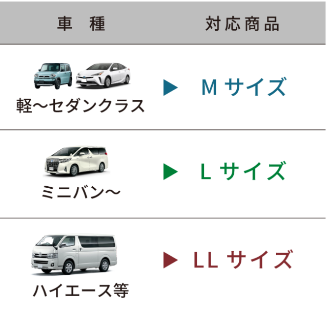 LLサイズはアルファードやヴェルファイアのような大型ミニバン、ハイエースなど大型車に対応。
