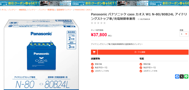 新車に搭載されている標準サイズは65B24Lですが、パナソニックカオスの80B24Lをおすすめします。