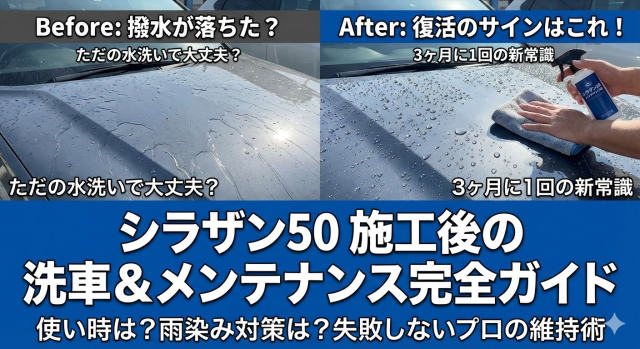 シラザン50施工後の洗車ガイド!メンテナンス剤の使い時は?公開日:2025年12月24日ガラスコーティング 「やっとの思いでシラザン50を施工し終えた!この鏡のような輝き、ずっと維持したい…」 「施工後はどうやって洗車すればいいんだろう?」 「適当に洗ってコーティングを傷つけたらどうしよう?」 シラザン50を使って時間と手間を […] 続きを読む